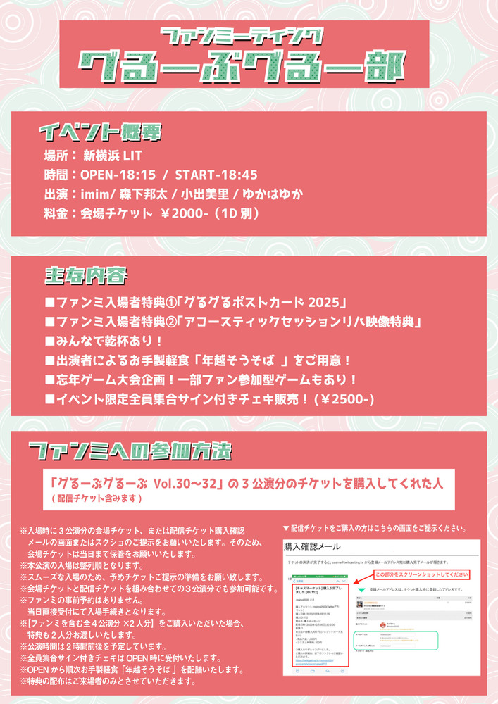 ■2025/10/4(土) 「グるーぶグるーぶ Vol.30〜ハロウィンSP〜」 場所:新横浜LIT 時間:OPEN-11:00/START-11:30 〈お楽しみ企画内容〉 ◆いたずらロシアンルーレット大会🎃 ◆ハロウィン衣装でステージ披露👻 ■2025/11/9(日) 「グるーぶグるーぶ Vol.31〜クリスマス超イヴSP〜」 場所:新横浜LIT 時間:OPEN-17:30/START-18:00 出演:imim/森下邦太/小出美里/ゆかはゆか 料金:前売券¥3500 当日券¥4000 配信チケット¥3500 〈お楽しみ企画内容〉 ◆グるグるサンタたちからのプレゼントじゃんけん大会✋ ◆クリスマスソングコラボステージ🎄 ■2025/12/27(土) 「グるーぶグるーぶ Vol.32〜年末SP〜」 場所:新横浜LIT 〈お楽しみ企画内容〉 本編後半はグるグるアコースティックセッション❗️ 大好評コラボステージを5人のアコースティック編成で挑戦‼️ ■2025/12/27(土) 「-ファンミーティング-グるーぶグるー部」 場所:新横浜LIT 時間:OPEN-18:15/START-18:45