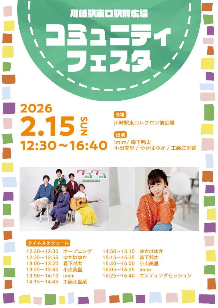 「コミュニティフェスタ」 ライブスケジュール 2026/02/15(日) 以前からお世話になっているハンドメイドマルシェとのコラボイベントとなります☺️ 音楽×食×ハンドメイド❗️ 今回はグるーぶグるーぶ総動員で出演❗️ ぜひ現地で一緒に楽しんでもらえたら嬉しいです✨ ーーーーーーーーーーーーーーーーーーーーーーー ■2026/2/15(日)「コミュニティフェスタ」場所:川崎駅東口 駅前広場(ルフロン前広場)時間:12:30〜出演:imim/森下邦太/小出美里/ゆかはゆか/工藤江里菜※観覧無料 雨天中止 URLをコピーする 報告する
